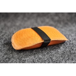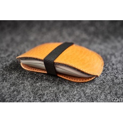 Ručně šité pouzdro na Apple Magic Mouse. Z hovězí usně, se zavíráním na gumový pásek.